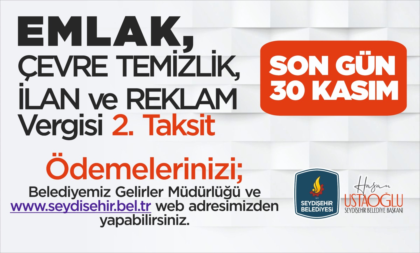 Belediyeden yapılan açıklamada, Emlak, Çevre Temizlik ve İlan Reklam Vergilerinin Mayıs ve Kasım aylarında olmak üzere iki eşit taksitte ödendiği hatırlatıldı.