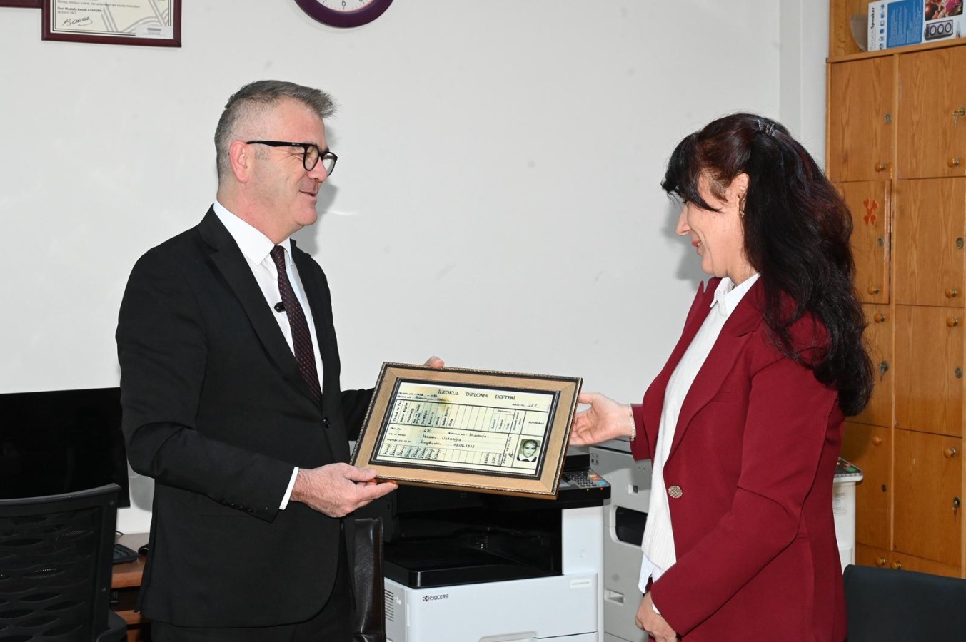 Okul Müdürü Dilek Abay ziyarette, “Başkanımızın okulumuzdan mezun olduğunu öğrenince okul arşivine göz attık. Diplomasını bulduktan sonra kendisine sürpriz yaparak hediye etmek istedik. Belediye Başkanımıza görevinde kolaylıklar diliyoruz.” dedi.