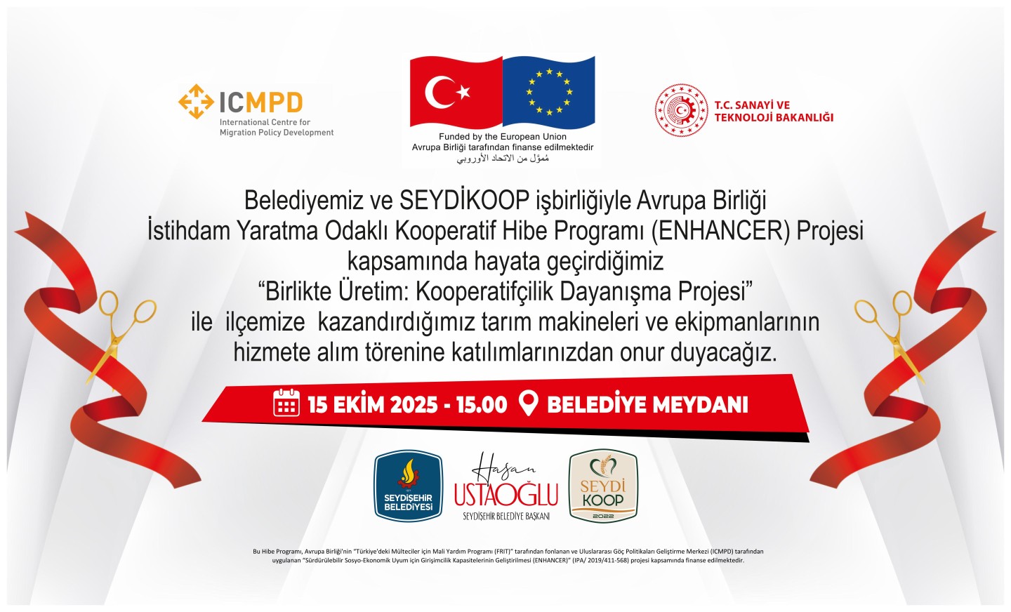 Avrupa Birliği tarafından finanse edilen ve uluslararası göç politikaları geliştirme merkezi (ıcmpd) tarafından, Sanayi ve Teknoloji Bakanlığı Kalkınma Ajansları Genel Müdürlüğü koordinasyonu ile yürütülen Enhancer projesi kapsamında uygulanan, istihdam yaratma odaklı kooperatif hibe programı kapsamında Seydikoop kadın üreticileri tarımsal kalkınma kooperatifi ve proje iştirakçisi Seydişehir Belediyesi hibe desteği almaya hak kazanarak, ilçede istihdamı artıracak ve tarımsal üretimi güçlendirecek önemli bir başarıya imza attı. Proje kapsamında ilçemize kazandırılan Traktör, çift kıyım ot silaj makinesi, mobil silaj paketleme makinesi, gübre serpme makinesi, hububat ekip mibzeri, tarla ilaçlama makinesi, yaylı çizel (patlatma) makinesi, döküm merdane makinesi, goble diskaro, namlu yapma makinesi, çayır biçme makinesi, tek sıra silaj makinesi düzenlenecek törenle hizmete alınacak.
